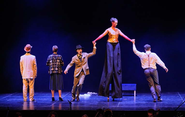 I quattro personaggi sono caratterizzati e distinti musicalmente e linguisticamente, e si intersecano con scambi giocosi. Talora dimenticano, nel loro incontro allegro ma duro da affrontare, quale sia la scena e quale la non scena; talora rientrano in scena correggendosi; tentano di comunicare in un semi-grammelot di matrice comune che nelle sue sfaccettature rende però impossibile la condivisione del proprio dramma con gli altri.